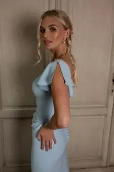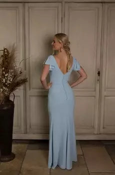 This elegant bridesmaid dress features a chic V-neckline with pearl and silver embellishment appliques at the shoulder that lead to split waterfall floaty sleeves. A simple thin belt cinches at the waist and a glamorous low v-back is finished with a zip and button trim. Our signature slim skirt with pleats at the hip complete the style and make for a super flattering fit. Also available in chiffon at Carter C.