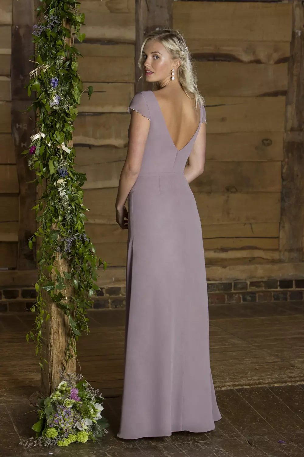 This elegant chiffon bridesmaid dress looks super classy with v-neck bodice and slim A-line skirt features a sheer single layer chiffon cap sleeve edged with a row of pearls and bugle beads. Perfect when paired with one of our mix and match belts, which can be ordered separately in a matching shade or contrast shade. Pictured wearing bridesmaids belt EB03. Also available in velvet as E210V.