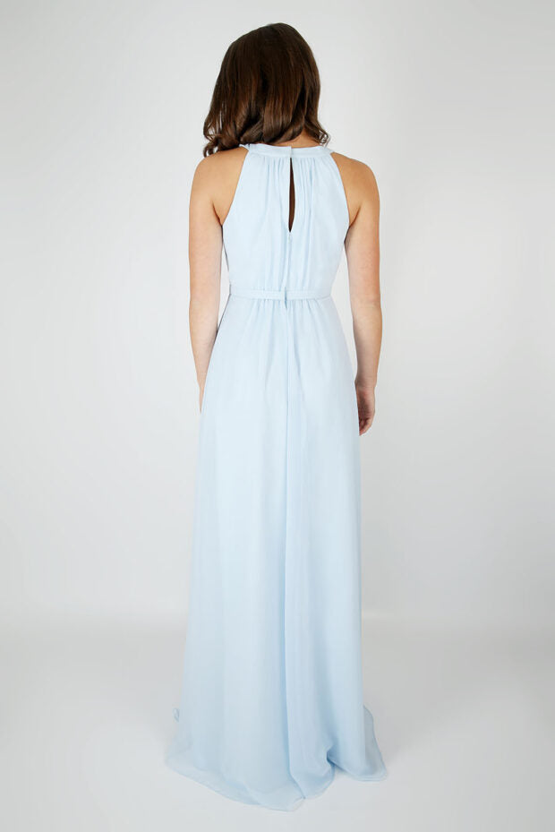 This flattering chiffon floor-length dress has a round neckline, gathered skirt and a split to the back bodice. Finished with a smooth chiffon waistband. Fastened with a zip at the back. Available in all Chiffon colours.