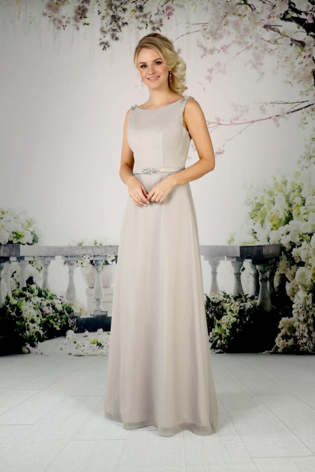 This high neck bateau shaped bodice leads to a flattering V-shaped back. It has a smooth A-line full chiffon skirt complete with satin waistband and satin covered buttons on the back of the bodice. Maze-like beaded detail at the waistline and shoulders add that distinct finishing touch. Fastened with a zip at the back. Available in any Chiffon colour. Satin will match chosen Chiffon colour. Shown in Navy.