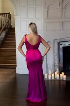 Luella is an elegant bridesmaid style with a V neckline and criss cross draped front bodice which is contrasted with a scooped back neckline. This dress is finished with our signature slim skirt with pleats at the hip for a figure enhancing look.