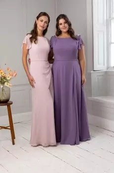 This chiffon bridesmaids dress features a chic boat neckline with pearl embellishment appliques at the shoulder leading to flattering waterfall cap sleeves. A simple chiffon belt cinches the waist and a glamorous low v-back is finished with a zip and button trim. Our signature slim skirt with pleats at the hip make for a super flattering fit.