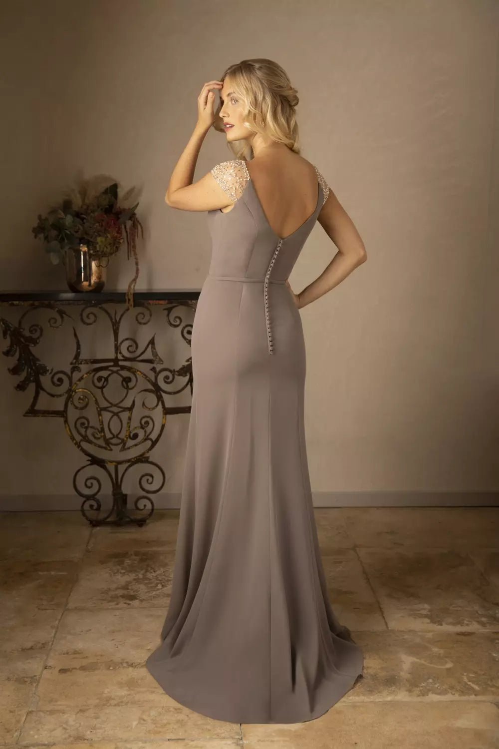 This elegant chiffon dress has a beautiful V-neckline to the front and a deep V- back neckline. Its sparkly beaded embellished tulle shoulders, give a cap like sleeve. It has our signature slim fit and flare skirt with dustier train giving it that extra super glam look. Finished with a narrow chiffon belt to cinch in the waist. At the back find a zip finished with buttons.